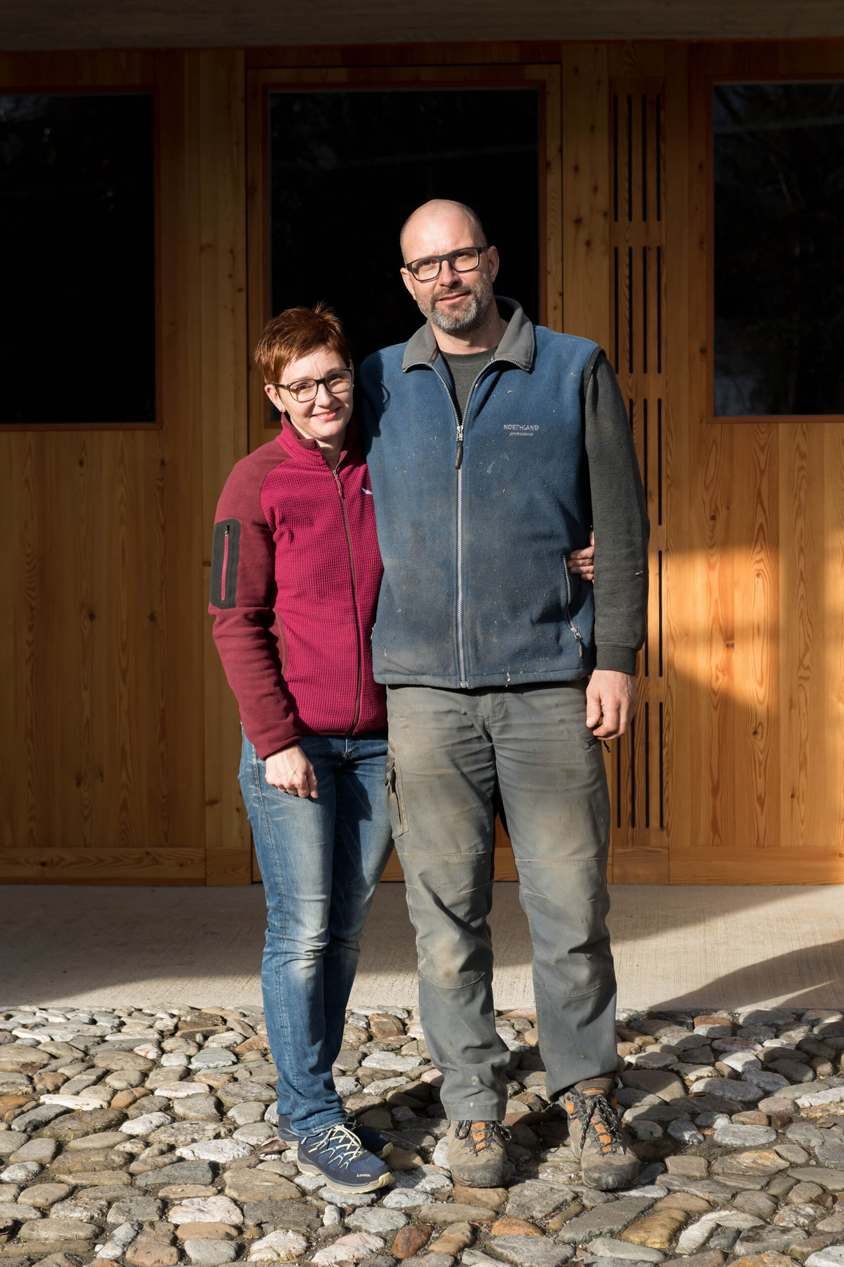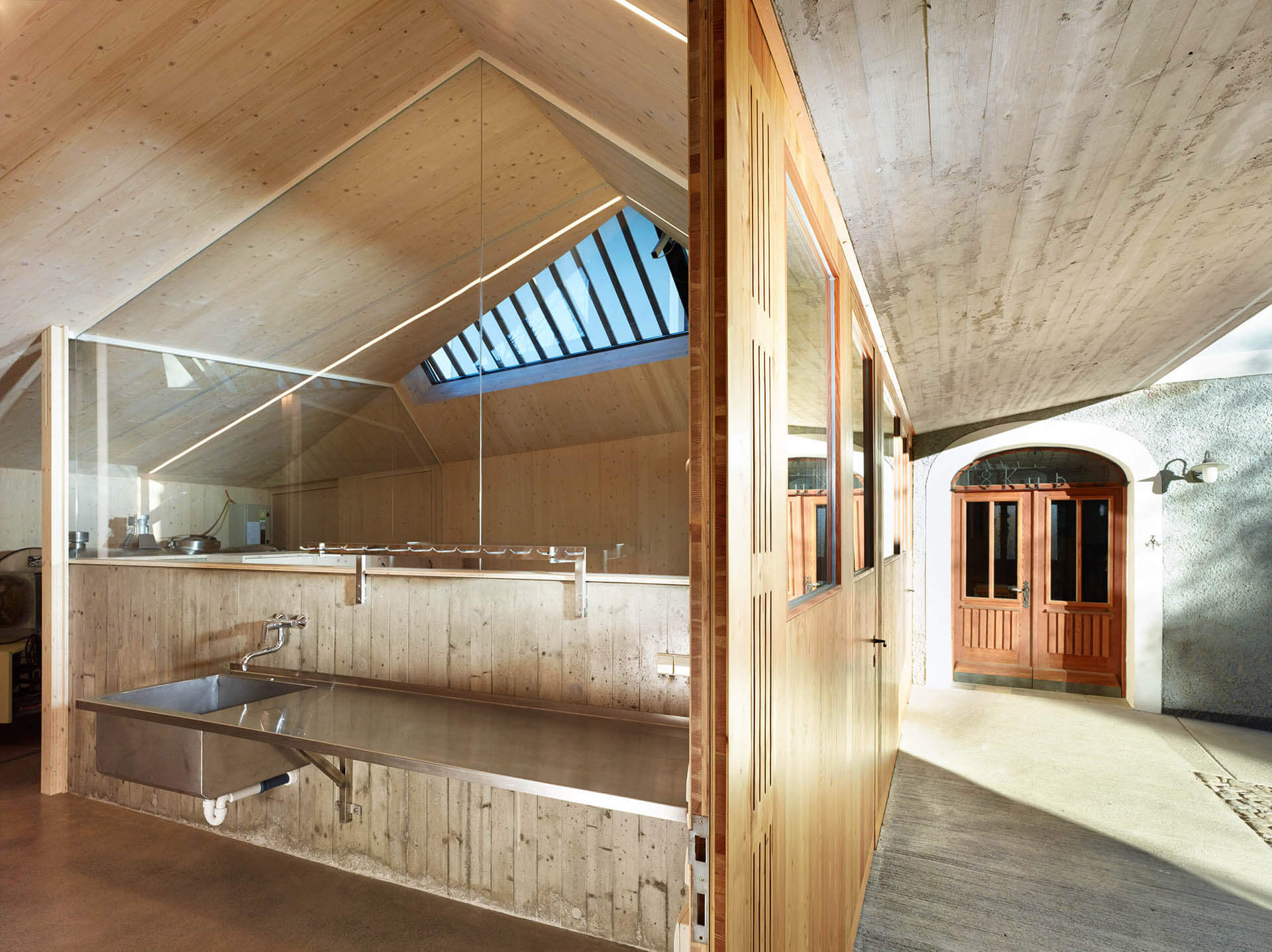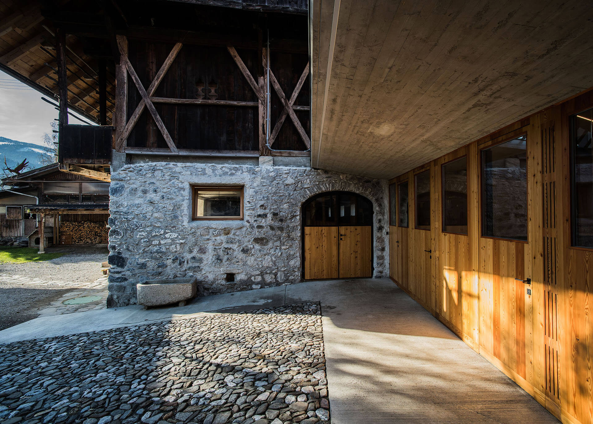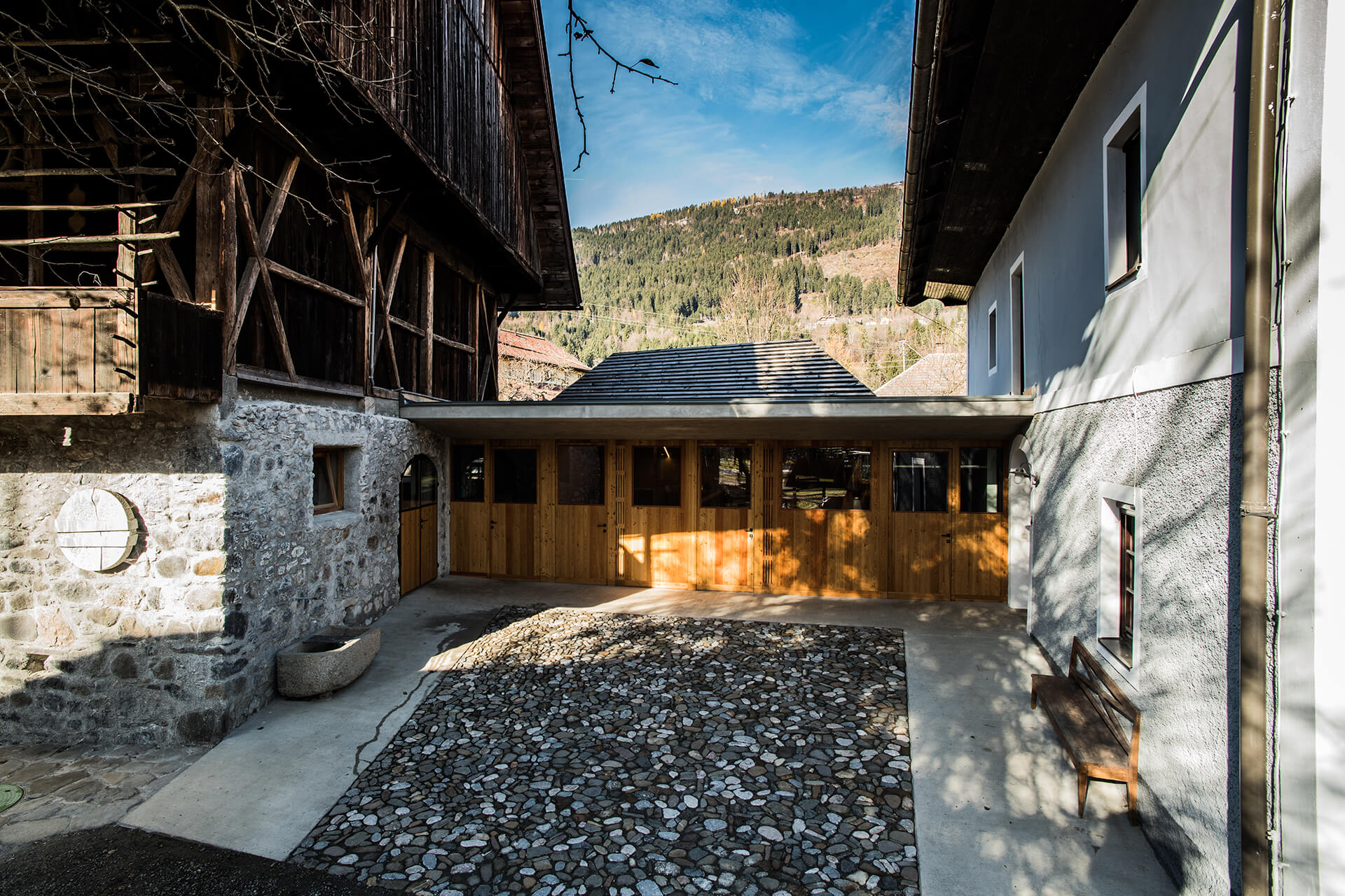 Ressourcen zu schonen und überlegt mit Material und Verbrauch umzugehen ist im täglichen Arbeitsablauf sehr wichtig. So war es auch klar, dass das neue Wirtschaftsgebäude mit demselben Anspruch an Qualität errichtet werden soll. Die besondere Anforderung: Zwei traditionelle Gebäude (Wohnhaus und Stall) mit einem Neubau so zu verbinden, dass es für alle Gebäude ein selbstbewusstes Auftreten gibt.
