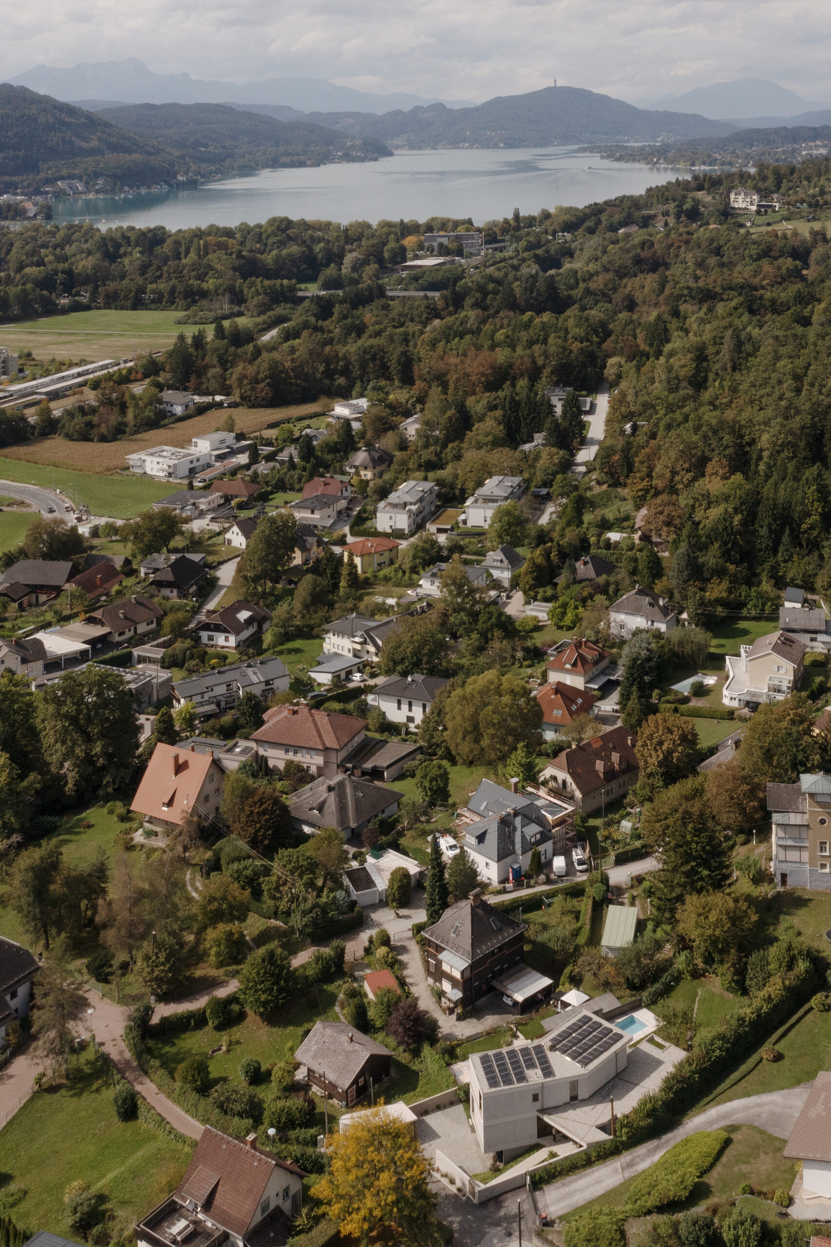 Die neue Kubatur orientiert sich an dem schmal geformten Grundstück und bietet bestmögliche Ausblicke auf die Bergkulisse. Die Fassade spiegelt den Wunsch nach Ausblick und Intimität wider.